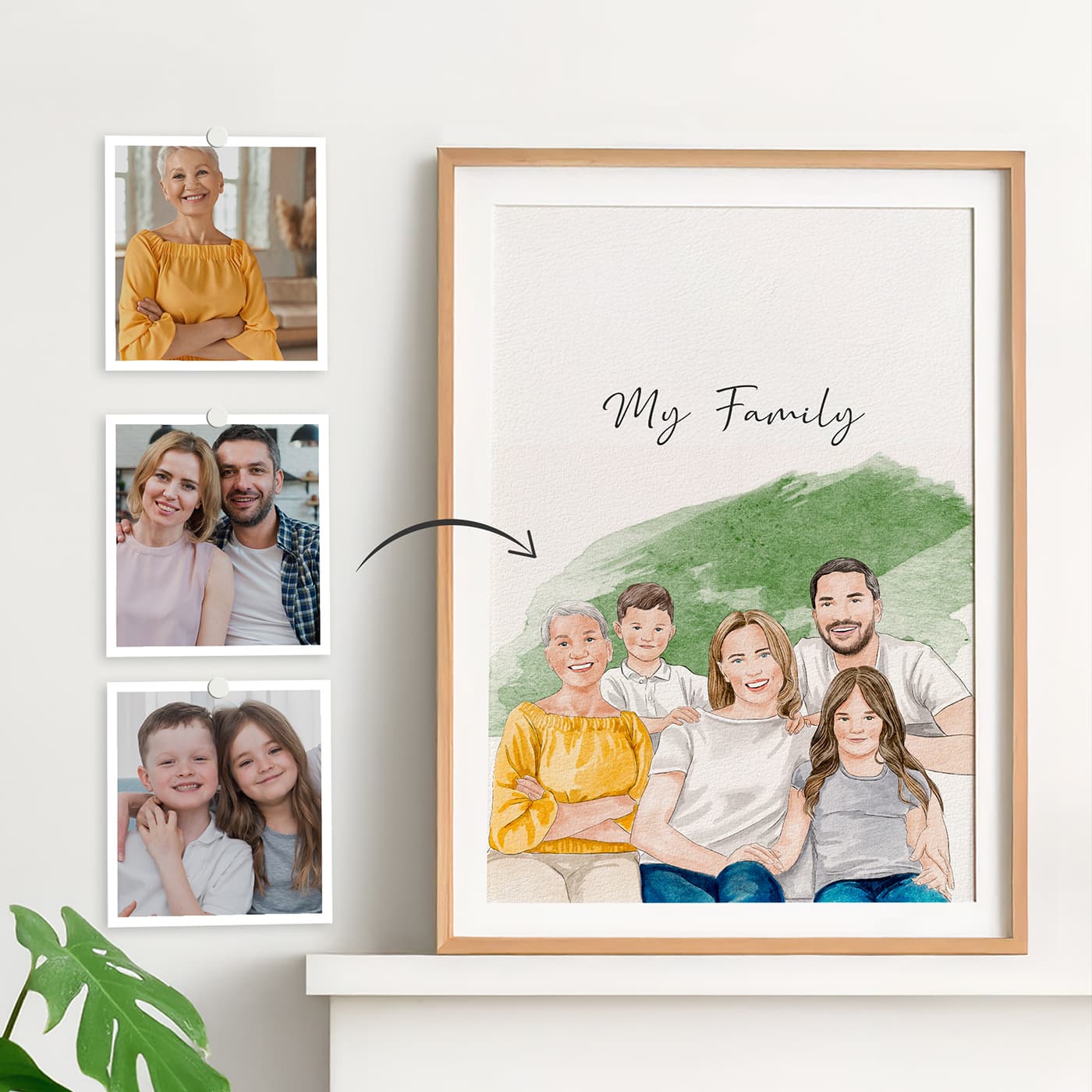 Choose your preferred size and framing options, upload your photos. Our skilled watercolor artist will begin painting your custom portrait within 24 hours.