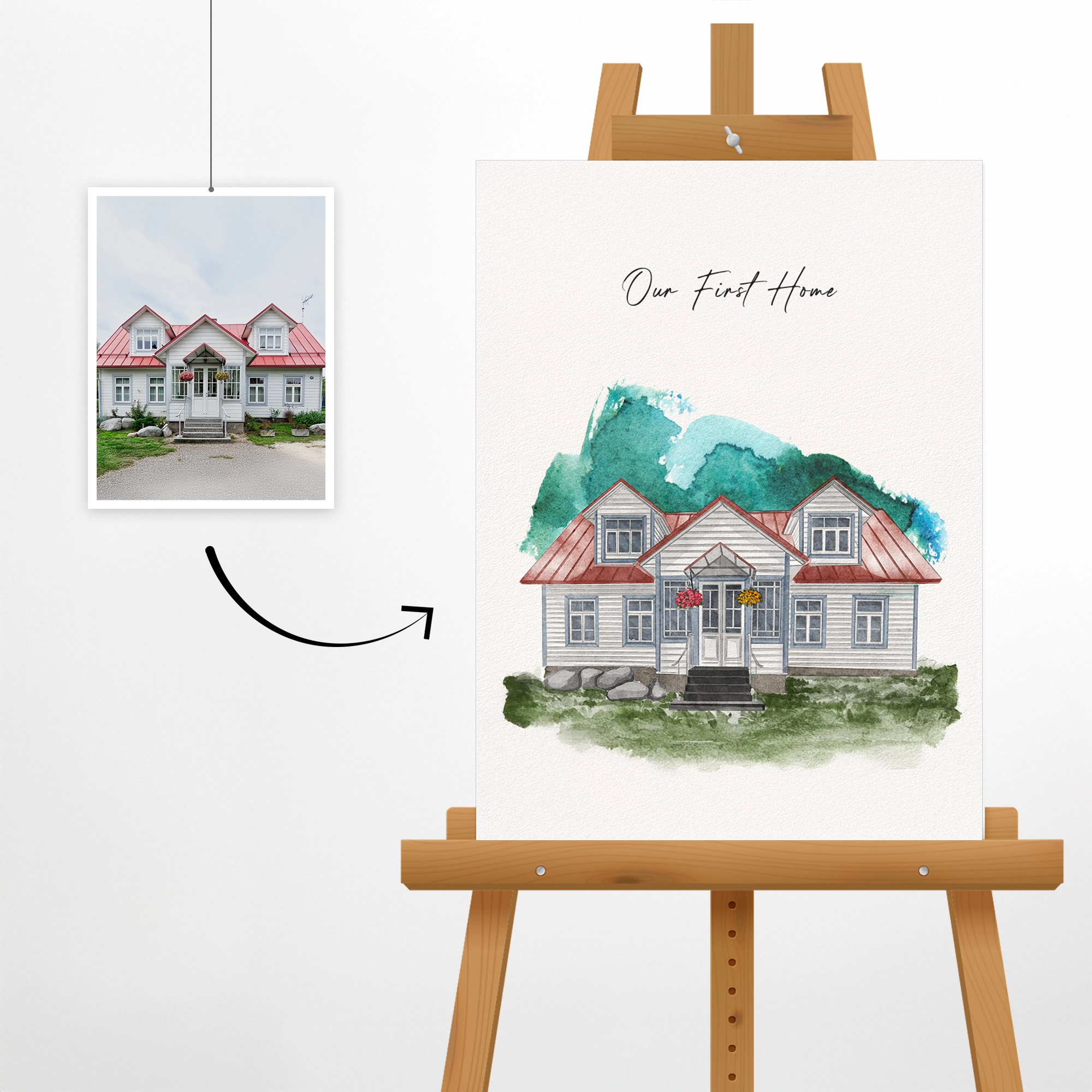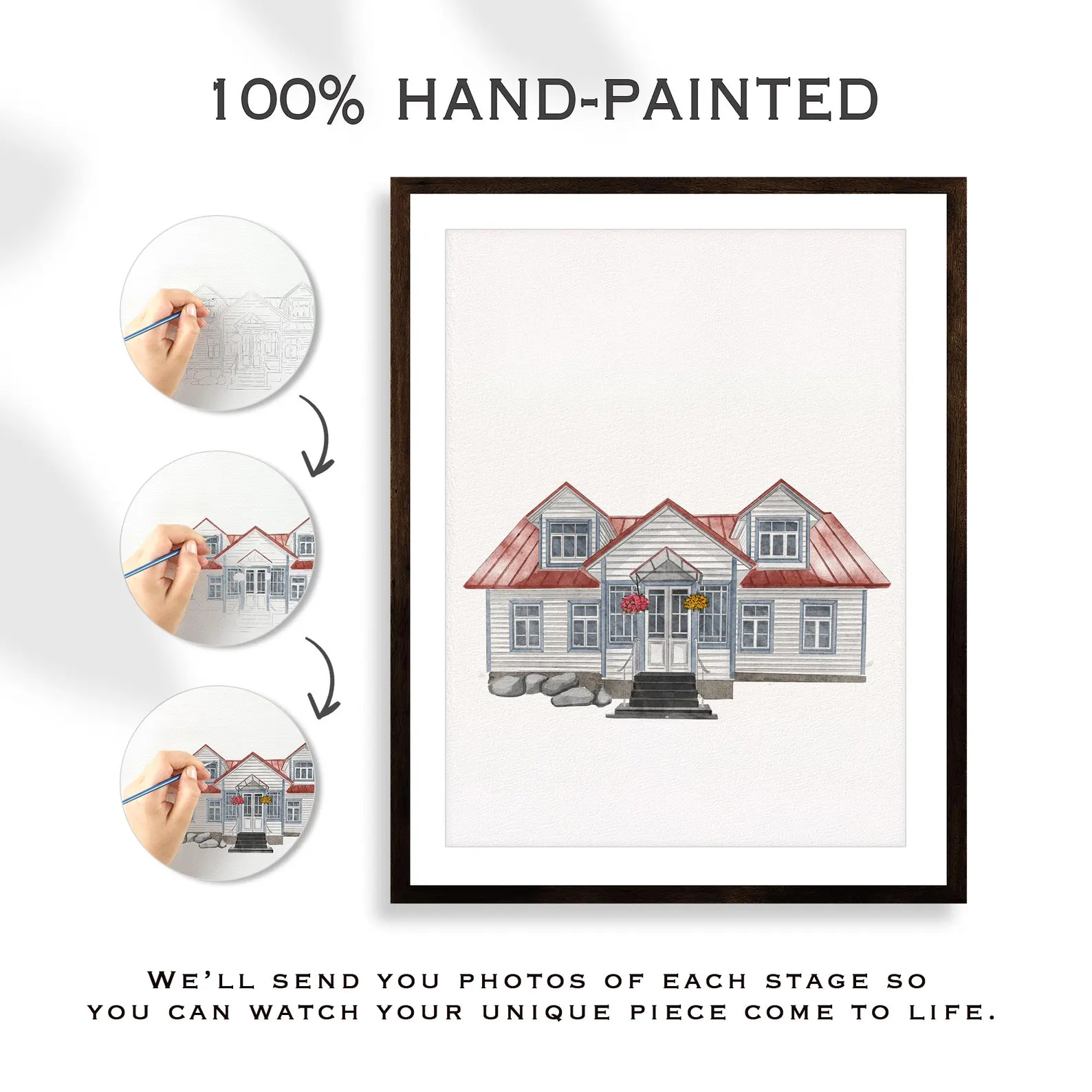 Choose your preferred size and framing options, upload your photos. Our skilled watercolor artist will begin painting your custom portrait within 24 hours.